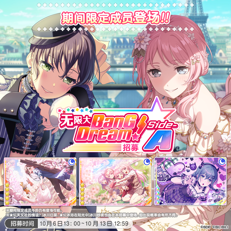 ★招募日程★ 10月6日13:00~10月13日12:59 ★招募简介★ 「无限大BanG Dream!招募 Side-A」新期间限定成员: ★5 花园多惠[奔跑在春天里] ★5 千早爱音[赏花会的纪念!] ★4 LOCK[笑容的圆环] ※在「无限大BanG Dream!招募 Side-B」中出现概率提升的限定成员★5 冰川日菜[天文社的情谊?]、★5 冰川纱夜[沐浴在阳光中]也会在本招募中出现,但出现概率不同。 ★「无限大BanG Dream!招募贴纸」的交换所交换对象★ ・对象角色 ★5 花园多惠[奔跑在春天里] ★5 冰川日菜[天文社的情谊?] ★5 冰川纱夜[沐浴在阳光中] ★5 千早爱音[赏花会的纪念!] ★4 LOCK[笑容的圆环] 除上述角色以外,本次兑换所中还可兑换试炼演出活动「SAKURA CiRCRiNG PARTY!」中符合角色加成的对象★4成员。 ■「无限大BanG Dream!招募」注意事项 ※「1日1次的招募」仅能使用付费星石进行。 ※「1日1次的招募」将于每天凌晨4点重置。 ※进行招募时将优先消耗免费星石。 ※通过本招募每重复获得1名成员时可以获得以下道具 ★5:「EX星光魔方」1个、「星光贴纸」30个 ★4:「星光魔方」100个、「星光贴纸」30个 ★3:「星光魔方」10个 ★2:「星光魔方」1个 ※通过「招募贴纸交换所」兑换重复成员时无法获得「星光贴纸」、「星光魔方」和「EX星光魔方」。 ※每从「无限大BanG Dream!招募 Side-A」中获得1名成员,即可对应地获得1枚「无限大BanG Dream!招募贴纸」。您可以通过主页的「菜单」>「交换所」前往「招募贴纸交换所」确认可交换成员或道具,并消耗招募贴纸进行交换。在本招募结束后,无法交换的招募贴纸将变为星光贴纸。 ※期间限定成员在今后仍有登场可能,但再次登场日程未定。 ※在「无限大BanG Dream!招募 Side-A」开展期间,如若想使用星光贴纸补充「无限大BanG Dream!招募贴纸」,则合计最多能补充100张。 ※若使用星光贴纸兑换「无限大BanG Dream!招募贴纸」已合计兑换100张,将无法再次使用星光贴纸补充「无限大BanG Dream!招募贴纸」。 ※您可以通过招募界面的[招募详情]查看具体的成员出现概率。 ※活动可能会未经预告有所变更,请以游戏内为准。 今后也请多多支持《BanG Dream! 少女乐团派对!》!