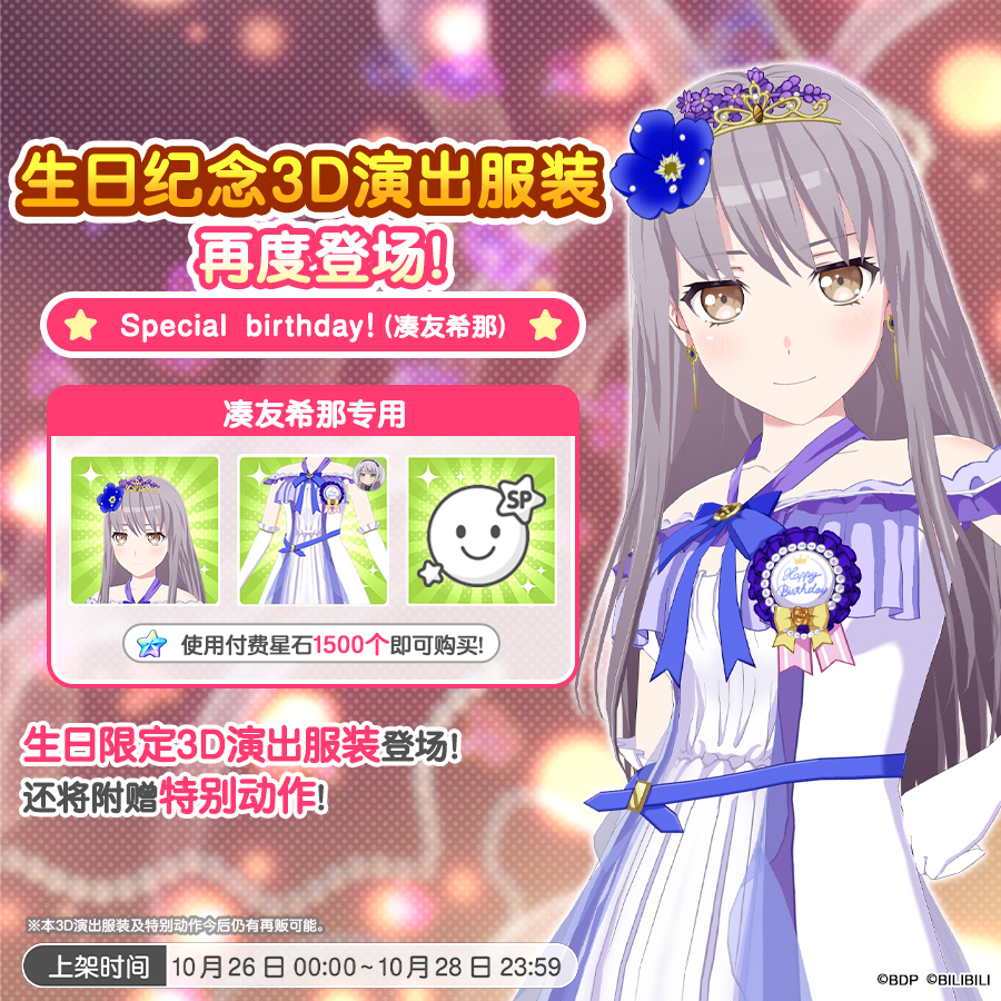 ★贩售时间★ 10月26日0:00~10月28日23:59 ★贩售价格★ 付费星石×1500 ★3D演出服装内容★ ・3D演出服装「Special Birthday(凑友希那)」 ・Special birthday!(凑友希那)「服装+发型・饰品」 ・动作「见证我们的觉悟吧(友希那专用)」 ★注意事项★ ※本礼包内容与过去曾经上架过的「友希那生日纪念3D演出服装」内容相同。 ※本礼包无法重复购买。 ※只能使用付费星石进行购买。 ※「Special Birthday」主题的「3D演出服装」无法进行「服装裁制」。 ※「Special Birthday」主题的「3D演出服装」没有异色服装。 ※「3D演出服装」今后仍有贩售可能。 今后也请多多支持《BanG Dream! 少女乐团派对!》!