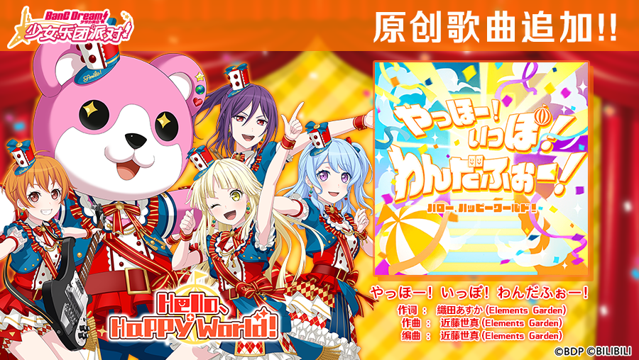 ★歌曲追加★ 曲名:やっほー!いっぽ!わんだふぉー! 演唱:Hello, Happy World! ※追加的原创歌曲将于今日维护后发放至您的礼物箱,还请您登录游戏领取~